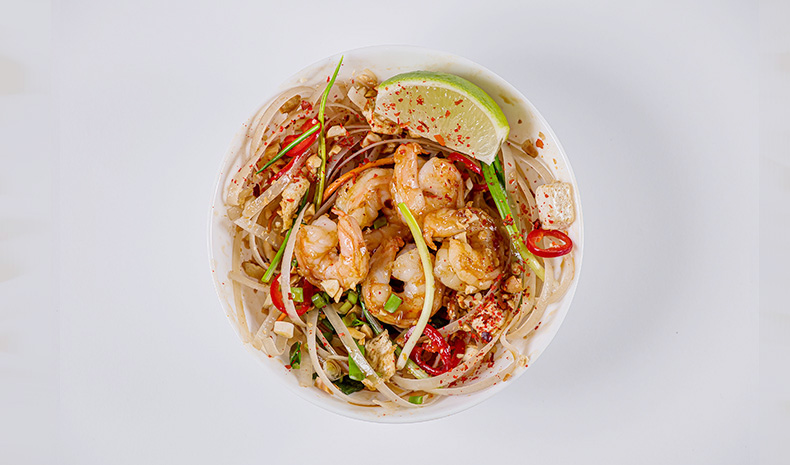 Локшина рисова, креветка тигрова, яйце, соус пад тай, свіжий чилі, арахіс, цибуля ріпчаста, цибуля зелена,лайм, морква, капуста б/к, часник