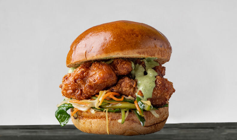 Булка бріошь, стегно куряче паніроване та обсмажене, салат з капусти, морковки, огірка та бебі шпинату, заправлений соєвим соусом та кунжутною олією, тайський соус