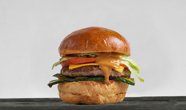 Булка бріош, яловича котлета, пряні свіжі огірки, цибуля свіжа кільцями, соус на основі чилі-джему, сичуанського перцю, бобової пасти, айолі та меду, сир чедер, свіжі томати, салат Айсберг.