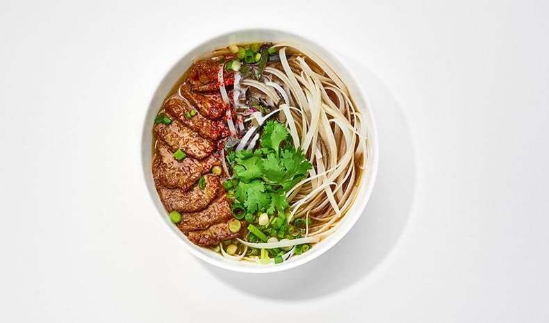Яловичий бульон з кардамоном, бадьяном та печеною цибулею,часником та імбирем, яловичина томлена, рисова локшина, шрірача соус, лайм, м`ята, кінза, зелена цибуля.