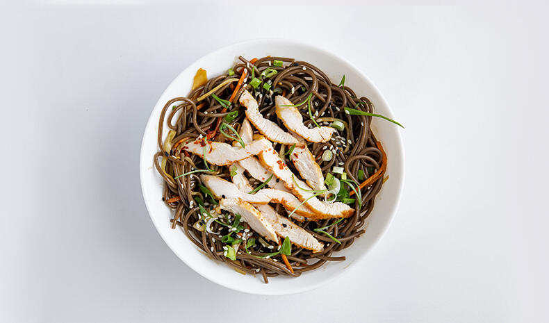 Гречана локшина соба, філе куряче, яйце, цибуля біла, морква, капуста бк, часник, соус на основі вустричного, хойсіна, та світлого соєвого, зелена цибуля, кунжут.